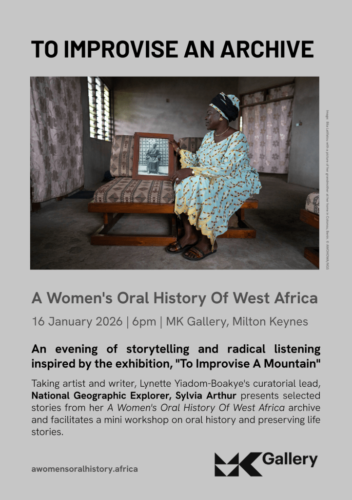 Last weekend, I gave a talk at MK Gallery titled “To Improvise An Archive”, inspired by and in response to their current exhibition, “To Improvise A Mountain”, curated by the acclaimed British-Ghanaian figurative painter Lynette Yiadom-Boakye. It brought the women from the “A Women’s Oral History Of West Africa” archive into conversation with artists and artworks featured in the exhibition, including Barbara Chase-Riboud, Glenn Ligon, Lisa Brice, Zoe Leonard and, of course, Lynette Yiadom-Boakye.